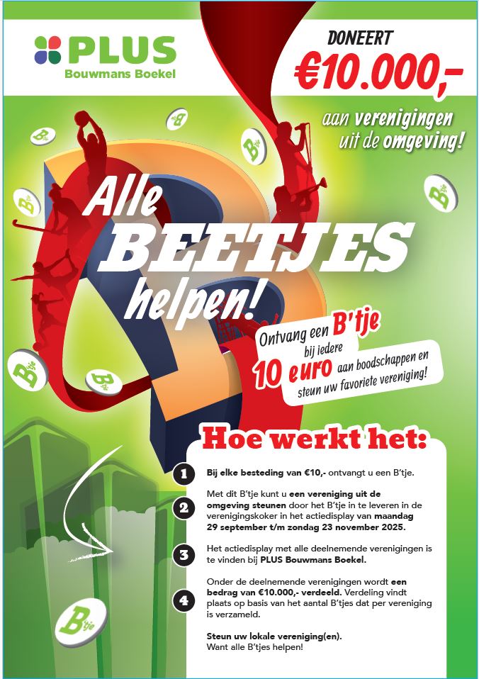 PLUS Boekel is gestart met een de actie Alle B’tjes helpen en wij zijn een van de verenigingen waaraan B’tjes gedoneerd kunnen worden! Bij elke €10 boodschappen krijg je een B’tje die je kunt doneren. Wij zijn je heel dankbaar als je ze aan Judoclub Boekel doneert!! De actie loopt tot en met zondag 23 november.